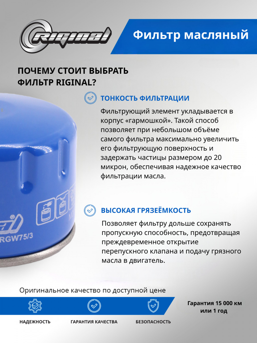 Фильтр масляный ТМ Riginal предназначен для качественной фильтрации смазочных масел в двигателях различных марок автомобилей.Оснащен высокоэффективным фильтрующим материалом Фильтрующий элемент укладывается в корпус «гармошкой». Такой способ позволяет при небольшом объёме самого фильтра максимально увеличить его фильтрующую поверхность и задержать частицы размером до 20 микрон. Фильтрующая гофра закреплена при помощи термореактивного клея. Корпус фильтра изготовлен из прочных и коррозионностойких материалов, запрессовка торцевых крышек надежная и точная, что гарантирует долговечность и надежность в различных условиях эксплуатации. Для производства антидренажного клапана используются специальные силиконовые материалы, обеспечивающие высокий уровень герметичности в условиях высоких температур. Значительная площадь герметизации фильтра, закругленные гладкие края отвечают за точную установку и максимальную защиту от утечек. Фильтр масляный ТМ Riginal является надежным решением для защиты двигателя.