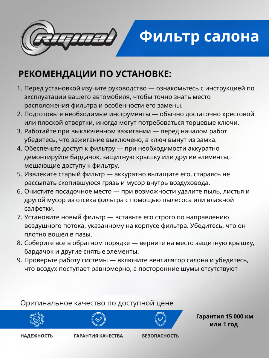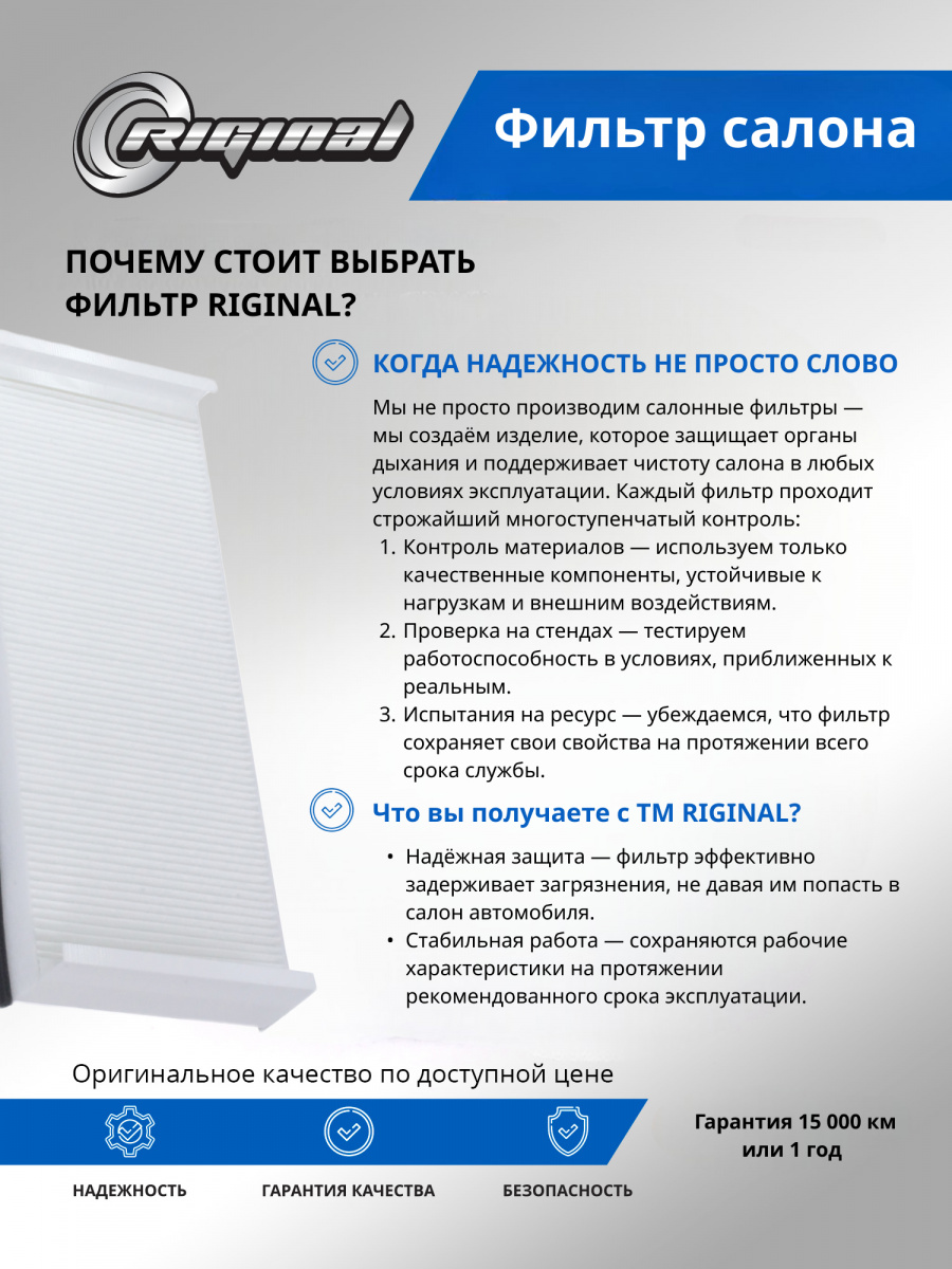 Фильтр салона от TM Riginal — это надежное и доступное решение для очистки воздуха в автомобиле. Он обеспечивает качественную фильтрацию воздуха, удаляя вредные частицы и запахи. Салонные фильтры ТМ Riginal отвечают самым высоким требованиям к пропускной способности благодаря использованию высококачественного фильтровального материала. Изготавливаются с учетом оригинальных геометрических параметров. Установка фильтра проста и не требует специальных навыков. В ассортименте Riginal представлены различные модели фильтров, что позволяет выбрать наиболее подходящий вариант для каждого автомобиля. Кроме того, фильтры ТМ Riginal соответствуют всем требованиям и стандартам качества, а также могут быть использованы как замена оригинальным фильтрам без потери эффективности.