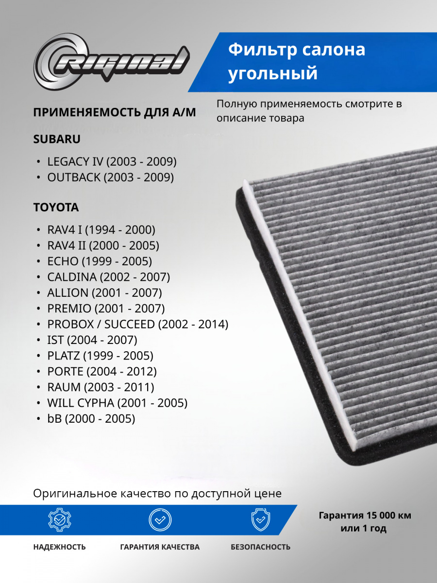 Салонный фильтр является важной деталью, обеспечивающей комфортное вождение. Он удерживает пыль, грязь и остальные мелкие частицы, которые могут попадать в салон, а также нейтрализует неприятные запахи благодаря активированному углю, содержащемуся в материале фильтра. Установка угольного фильтра гарантирует улучшение микроклимата внутри авто, что особенно важно при длительных поездках и в условиях городского трафика.Фильтр салона от TM Riginal - это надежное и доступное решение для очистки воздуха в автомобиле. Он обеспечивает качественную фильтрацию воздуха, удаляя вредные частицы и запахи. Установка фильтра проста и не требует специальных навыков. В ассортименте угольных фильтров салона ТM Riginal представлены различные модели, что позволяет выбрать наиболее подходящий вариант для каждого автомобиля. Кроме того, фильтры ТМ Riginal соответствуют всем требованиям и стандартам качества, а также могут быть использованы как замена оригинальным фильтрам без потери эффективности.