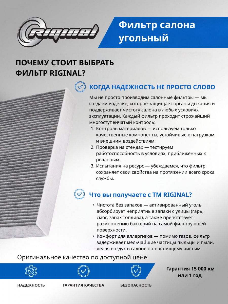 Салонный фильтр является важной деталью, обеспечивающей комфортное вождение. Он удерживает пыль, грязь и остальные мелкие частицы, которые могут попадать в салон, а также нейтрализует неприятные запахи благодаря активированному углю, содержащемуся в материале фильтра. Установка угольного фильтра гарантирует улучшение микроклимата внутри авто, что особенно важно при длительных поездках и в условиях городского трафика.Фильтр салона от TM Riginal - это надежное и доступное решение для очистки воздуха в автомобиле. Он обеспечивает качественную фильтрацию воздуха, удаляя вредные частицы и запахи. Установка фильтра проста и не требует специальных навыков. В ассортименте угольных фильтров салона ТM Riginal представлены различные модели, что позволяет выбрать наиболее подходящий вариант для каждого автомобиля. Кроме того, фильтры ТМ Riginal соответствуют всем требованиям и стандартам качества, а также могут быть использованы как замена оригинальным фильтрам без потери эффективности.