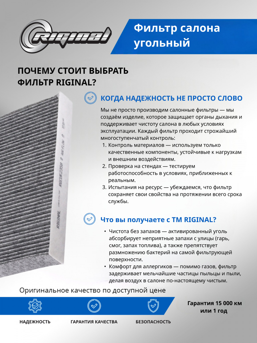 Салонный фильтр является важной деталью, обеспечивающей комфортное вождение. Он удерживает пыль, грязь и остальные мелкие частицы, которые могут попадать в салон, а также нейтрализует неприятные запахи благодаря активированному углю, содержащемуся в материале фильтра. Установка угольного фильтра гарантирует улучшение микроклимата внутри авто, что особенно важно при длительных поездках и в условиях городского трафика.Фильтр салона от TM Riginal - это надежное и доступное решение для очистки воздуха в автомобиле. Он обеспечивает качественную фильтрацию воздуха, удаляя вредные частицы и запахи. Установка фильтра проста и не требует специальных навыков. В ассортименте угольных фильтров салона ТM Riginal представлены различные модели, что позволяет выбрать наиболее подходящий вариант для каждого автомобиля. Кроме того, фильтры ТМ Riginal соответствуют всем требованиям и стандартам качества, а также могут быть использованы как замена оригинальным фильтрам без потери эффективности.