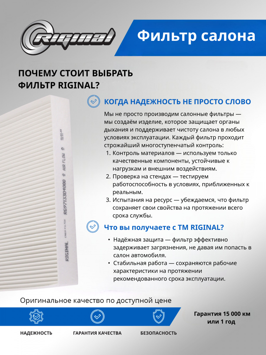 Фильтр салона от TM Riginal — это надежное и доступное решение для очистки воздуха в автомобиле. Он обеспечивает качественную фильтрацию воздуха, удаляя вредные частицы и запахи. Салонные фильтры ТМ Riginal отвечают самым высоким требованиям к пропускной способности благодаря использованию высококачественного фильтровального материала. Изготавливаются с учетом оригинальных геометрических параметров. Установка фильтра проста и не требует специальных навыков. В ассортименте Riginal представлены различные модели фильтров, что позволяет выбрать наиболее подходящий вариант для каждого автомобиля. Кроме того, фильтры ТМ Riginal соответствуют всем требованиям и стандартам качества, а также могут быть использованы как замена оригинальным фильтрам без потери эффективности.