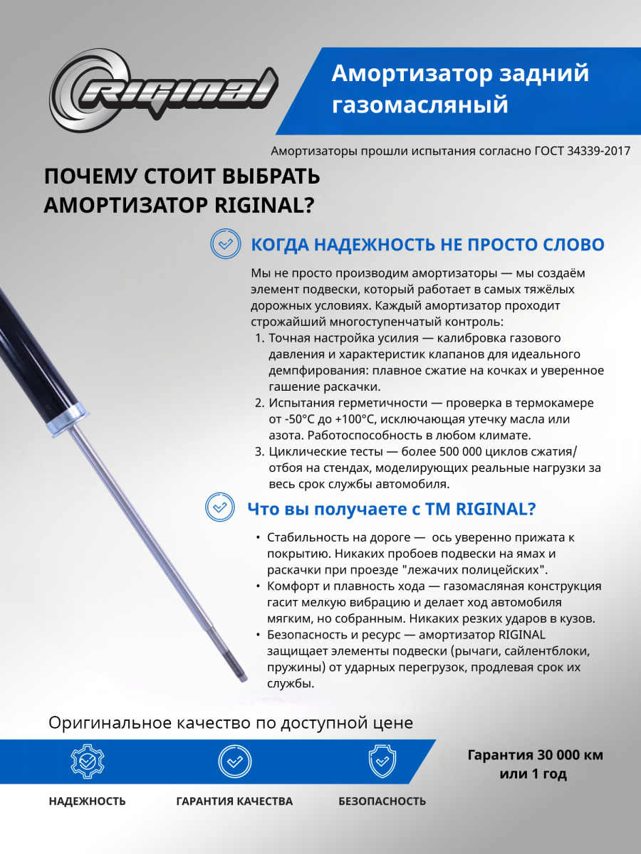 Амортизатор – это гаситель продольных и поперечных колебаний кузова автомобиля. Амортизаторы обеспечивают непрерывный контакт колёс с дорогой и помогают нивелировать толчки и колебания при движении. Газомасляные устройства имеют двухтрубную конструкцию: внутренняя труба с маслом и внешняя — с газом, сжатым от 4 до 8 атмосфер. Благодаря использованию газомасляных технологий, амортизаторы ТМ Riginal обладают более эффективным демпфированием по сравнению с традиционными масляными амортизаторами, что обеспечивает лучшую управляемость и устойчивость на дороге, особенно на высоких скоростях и при прохождении поворотов. Преимущества газомасляных амортизаторов ТМ Riginal: инновационная технология производства, контроль качества при производстве каждой позиции по чертежам, высокая прочность, позволяющая выдерживать большие нагрузки и сохранять свои свойства на протяжении всего срока эксплуатации.