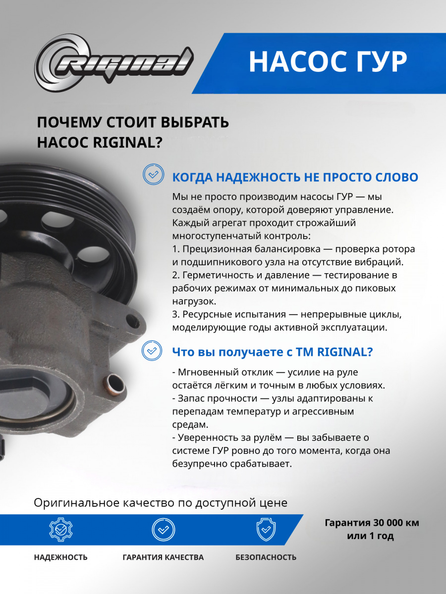 Главное отличие насосов ГУР ТМ RIGINAL – точность изготовления ротора и лопастей для создания нужного давления, использование регулятора давления для контроля, специфика присоединительных штуцеров под конкретную модель автомобиля, а также качество сборки, т.е.соответствие всем требуемым техническим характеристикам (подача, давление, скорость вращения),что определяет 100% эффективность и стабильность работы.