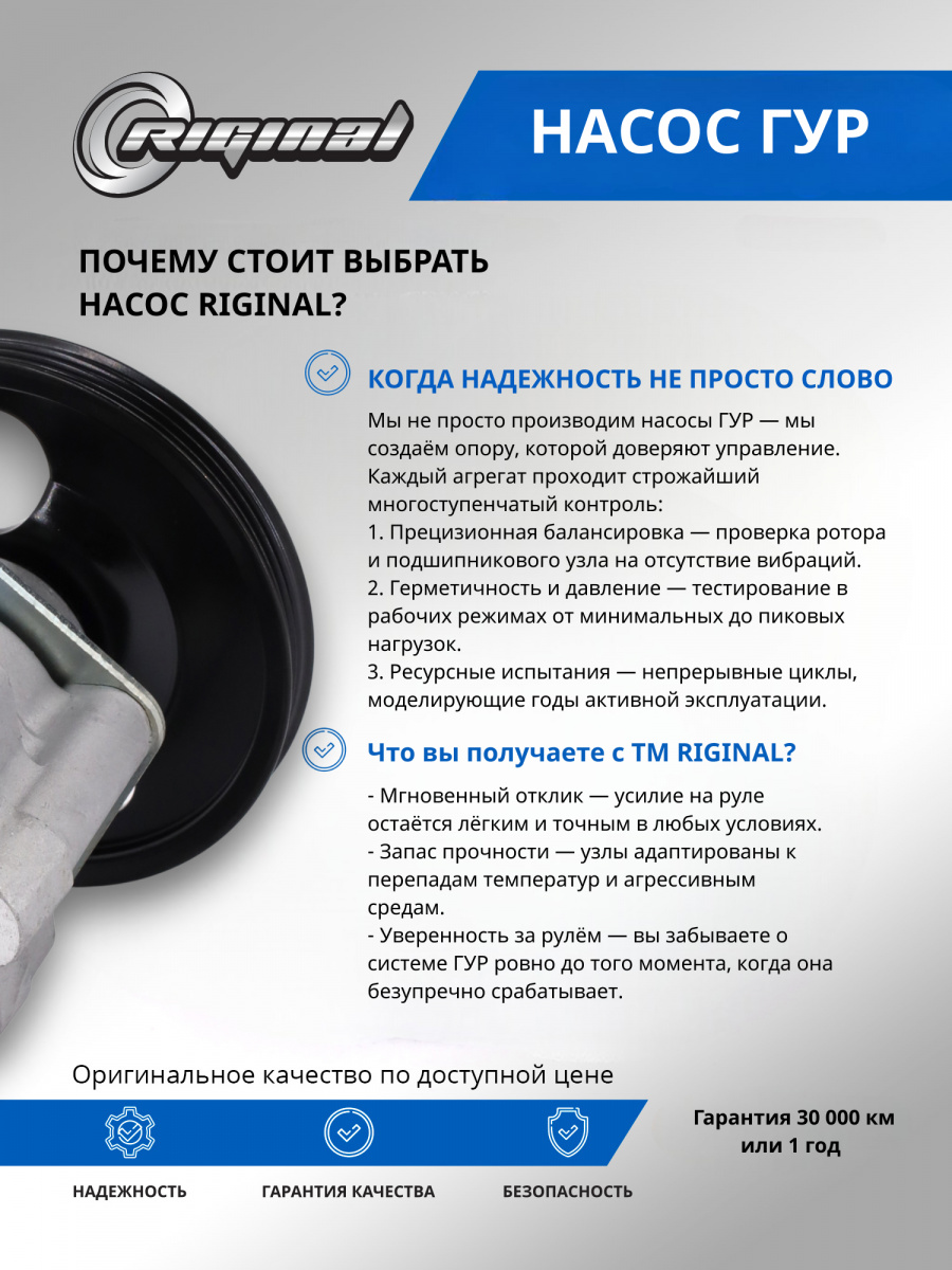 Главное отличие насосов ГУР ТМ RIGINAL – точность изготовления ротора и лопастей для создания нужного давления, использование регулятора давления для контроля, специфика присоединительных штуцеров под конкретную модель автомобиля, а также качество сборки, т.е.соответствие всем требуемым техническим характеристикам (подача, давление, скорость вращения),что определяет 100% эффективность и стабильность работы.