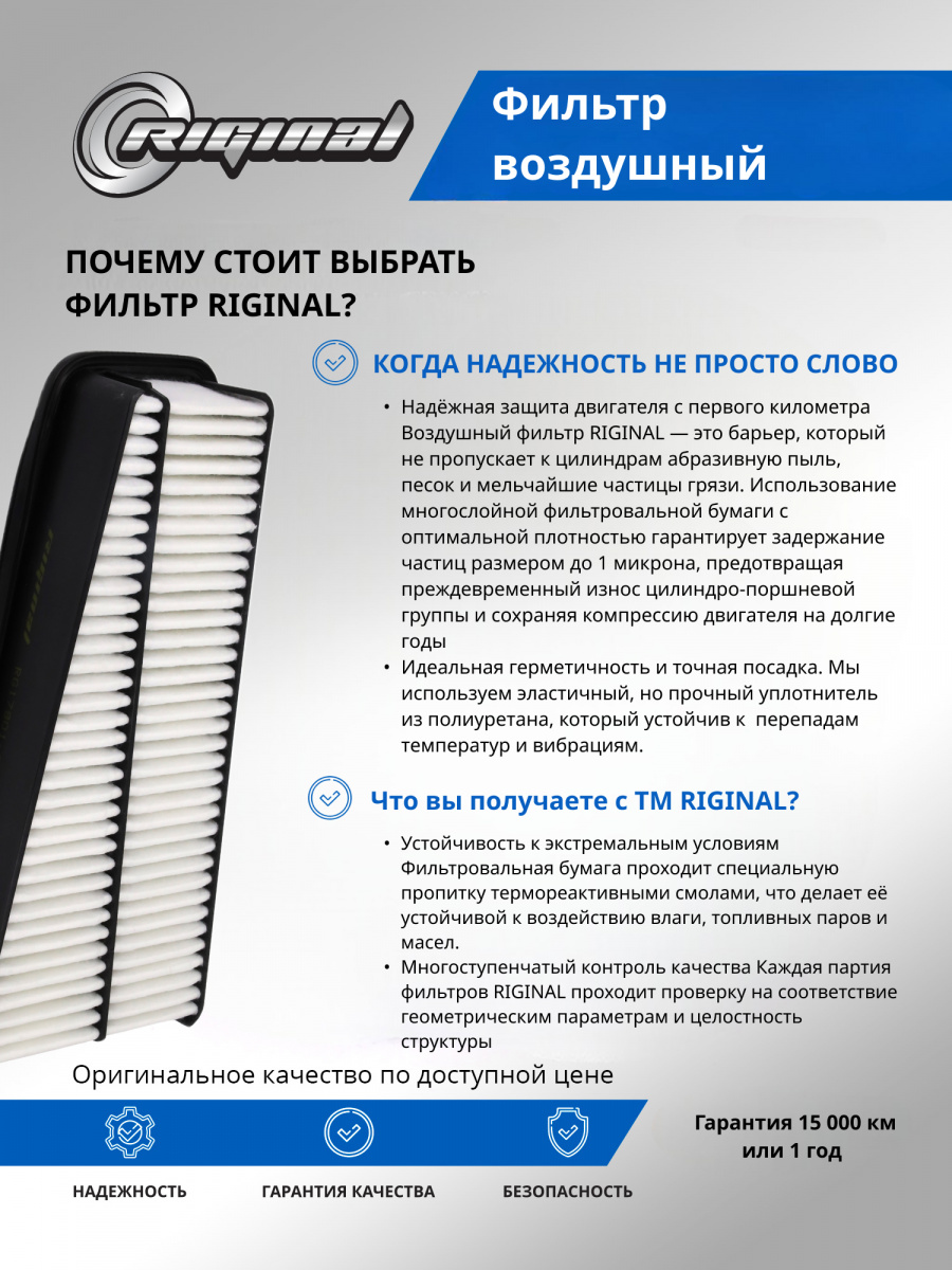 Воздушные фильтры двигателя ТМ “Riginal” представляют собой высококачественные устройства для очистки воздуха, используемого двигателем автомобиля. Разработанные и произведенные в соответствии с высокими стандартами качества, эти фильтры обеспечивают эффективную защиту двигателя от попадания пыли, грязи и других нежелательных частиц, которые могут вызвать износ и повреждение внутренних компонентов.Фильтры двигателя ТМ“Riginal” доступны в различных размерах и моделях для широкого спектра марок и моделей автомобилей. Они изготовлены из прочных и долговечных материалов, обеспечивая долгий срок службы и оптимальную производительность. Фильтры легко устанавливаются и снимаются для периодической замены, обеспечивая простоту обслуживания и экономию времени.Отличительной особенностью воздушных фильтров двигателя“Riginal” является их способность улавливать даже самые мелкие частицы грязи, предотвращая их попадание в чувствительные компоненты двигателя. Это позволяет поддерживать оптимальное функционирование двигателя.