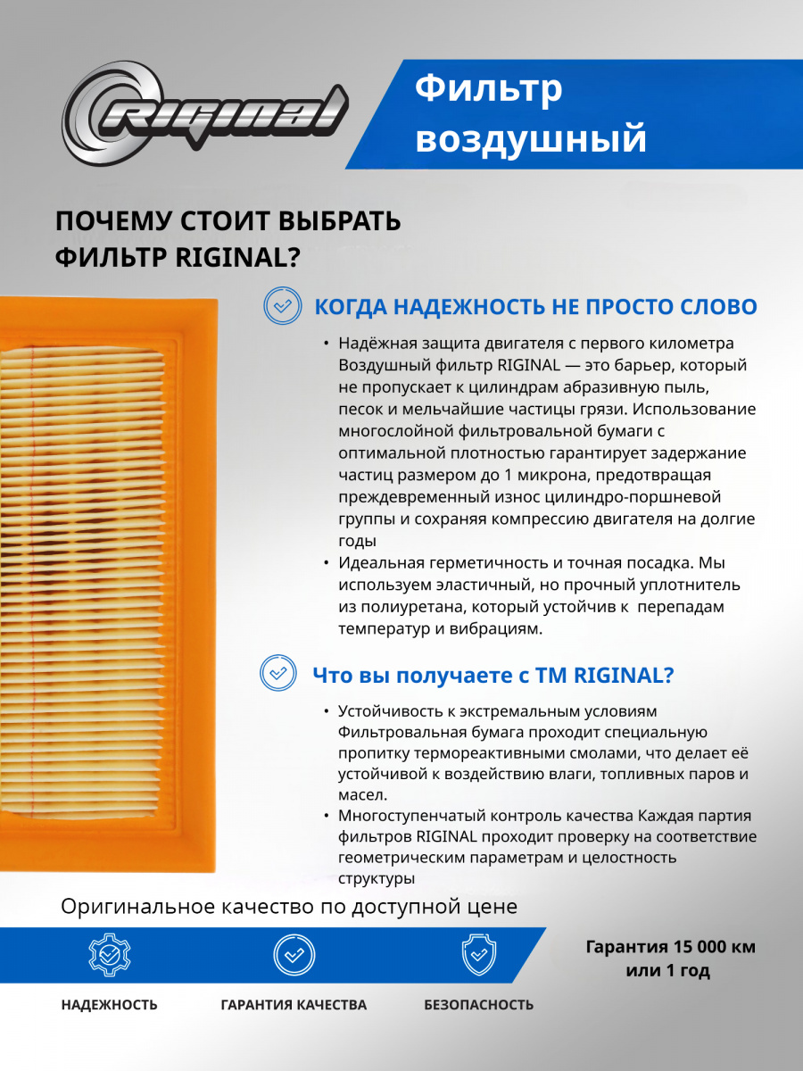 Воздушные фильтры двигателя ТМ “Riginal” представляют собой высококачественные устройства для очистки воздуха, используемого двигателем автомобиля. Разработанные и произведенные в соответствии с высокими стандартами качества, эти фильтры обеспечивают эффективную защиту двигателя от попадания пыли, грязи и других нежелательных частиц, которые могут вызвать износ и повреждение внутренних компонентов.Фильтры двигателя ТМ“Riginal” доступны в различных размерах и моделях для широкого спектра марок и моделей автомобилей. Они изготовлены из прочных и долговечных материалов, обеспечивая долгий срок службы и оптимальную производительность. Фильтры легко устанавливаются и снимаются для периодической замены, обеспечивая простоту обслуживания и экономию времени.Отличительной особенностью воздушных фильтров двигателя“Riginal” является их способность улавливать даже самые мелкие частицы грязи, предотвращая их попадание в чувствительные компоненты двигателя. Это позволяет поддерживать оптимальное функционирование двигателя.