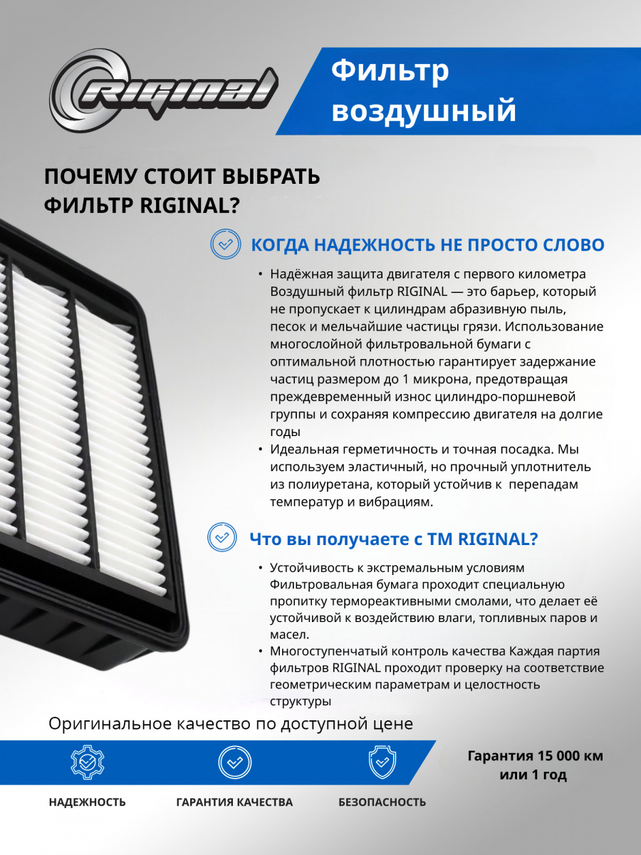 Воздушные фильтры двигателя ТМ “Riginal” представляют собой высококачественные устройства для очистки воздуха, используемого двигателем автомобиля. Разработанные и произведенные в соответствии с высокими стандартами качества, эти фильтры обеспечивают эффективную защиту двигателя от попадания пыли, грязи и других нежелательных частиц, которые могут вызвать износ и повреждение внутренних компонентов.Фильтры двигателя ТМ“Riginal” доступны в различных размерах и моделях для широкого спектра марок и моделей автомобилей. Они изготовлены из прочных и долговечных материалов, обеспечивая долгий срок службы и оптимальную производительность. Фильтры легко устанавливаются и снимаются для периодической замены, обеспечивая простоту обслуживания и экономию времени.Отличительной особенностью воздушных фильтров двигателя“Riginal” является их способность улавливать даже самые мелкие частицы грязи, предотвращая их попадание в чувствительные компоненты двигателя. Это позволяет поддерживать оптимальное функционирование двигателя.