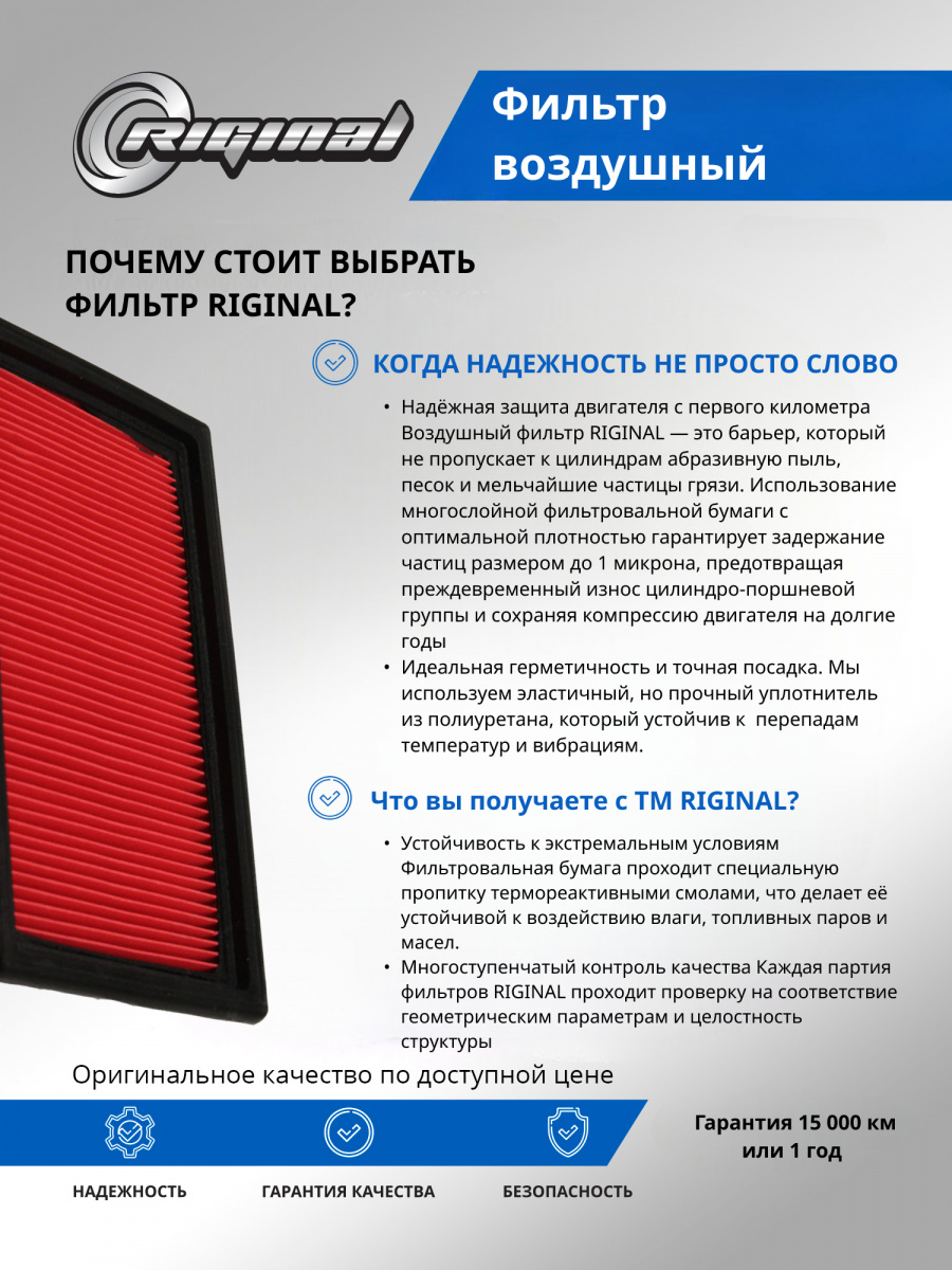 Воздушные фильтры двигателя ТМ “Riginal” представляют собой высококачественные устройства для очистки воздуха, используемого двигателем автомобиля. Разработанные и произведенные в соответствии с высокими стандартами качества, эти фильтры обеспечивают эффективную защиту двигателя от попадания пыли, грязи и других нежелательных частиц, которые могут вызвать износ и повреждение внутренних компонентов.Фильтры двигателя ТМ“Riginal” доступны в различных размерах и моделях для широкого спектра марок и моделей автомобилей. Они изготовлены из прочных и долговечных материалов, обеспечивая долгий срок службы и оптимальную производительность. Фильтры легко устанавливаются и снимаются для периодической замены, обеспечивая простоту обслуживания и экономию времени.Отличительной особенностью воздушных фильтров двигателя“Riginal” является их способность улавливать даже самые мелкие частицы грязи, предотвращая их попадание в чувствительные компоненты двигателя. Это позволяет поддерживать оптимальное функционирование двигателя.