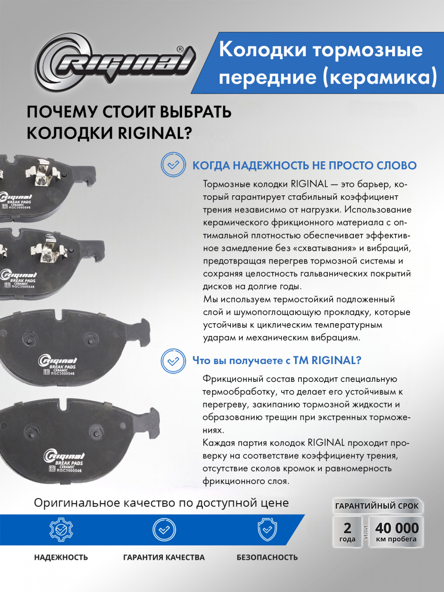 Керамические тормозные колодки — находка для водителей, которые ценят тишину, ровную педаль и чистые колёса. Они мягче взаимодействуют с чугунным диском, не пылят как полуметалл и дают предсказуемое замедление в городских пробках и на трассе. Cовременные керамические составы, применяемые при производстве, уверенно держат себя в рамках легальной скорости и при редких интенсивных торможениях. Эффективности хватает с запасом. Преимущества тормозных колодок ТМ RIGINAL: эффективность торможения, повышенная коррозионная стойкость, отсутствие скрипа. Керамические тормозные колодки ТМ Riginal ценятся в первую очередь за их долгий срок службы, а еще за стабильную работу на протяжении всего срока эксплуатации. Продукция сертифицирована.