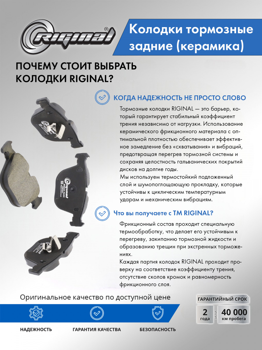 Керамические тормозные колодки — находка для водителей, которые ценят тишину, ровную педаль и чистые колёса. Они мягче взаимодействуют с чугунным диском, не пылят как полуметалл и дают предсказуемое замедление в городских пробках и на трассе. Cовременные керамические составы, применяемые при производстве, уверенно держат себя в рамках легальной скорости и при редких интенсивных торможениях. Эффективности хватает с запасом. Преимущества тормозных колодок ТМ RIGINAL: эффективность торможения, повышенная коррозионная стойкость, отсутствие скрипа. Керамические тормозные колодки ТМ Riginal ценятся в первую очередь за их долгий срок службы, а еще за стабильную работу на протяжении всего срока эксплуатации. Продукция сертифицирована.