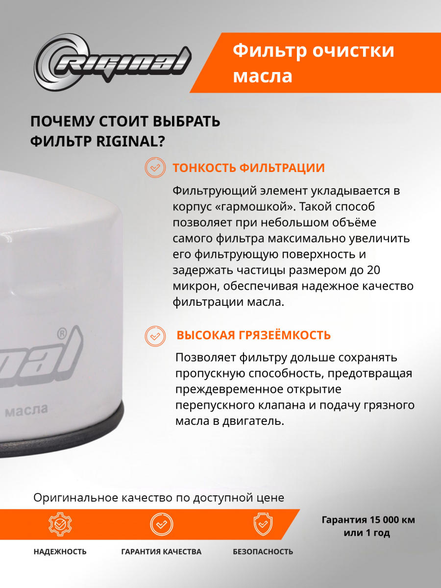 Фильтр масляный ТМ Riginal предназначен для качественной фильтрации смазочных масел в двигателях различных марок автомобилей.Оснащен высокоэффективным фильтрующим материалом Фильтрующий элемент укладывается в корпус «гармошкой». Такой способ позволяет при небольшом объёме самого фильтра максимально увеличить его фильтрующую поверхность и задержать частицы размером до 20 микрон. Фильтрующая гофра закреплена при помощи термореактивного клея. Корпус фильтра изготовлен из прочных и коррозионностойких материалов, запрессовка торцевых крышек надежная и точная, что гарантирует долговечность и надежность в различных условиях эксплуатации. Для производства антидренажного клапана используются специальные силиконовые материалы, обеспечивающие высокий уровень герметичности в условиях высоких температур. Значительная площадь герметизации фильтра, закругленные гладкие края отвечают за точную установку и максимальную защиту от утечек. Фильтр масляный ТМ Riginal является надежным решением для защиты двигателя.