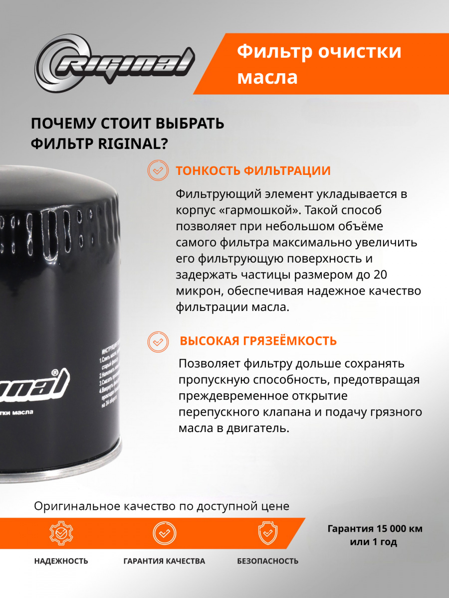 Фильтр масляный ТМ Riginal предназначен для качественной фильтрации смазочных масел в двигателях различных марок автомобилей.Оснащен высокоэффективным фильтрующим материалом Фильтрующий элемент укладывается в корпус «гармошкой». Такой способ позволяет при небольшом объёме самого фильтра максимально увеличить его фильтрующую поверхность и задержать частицы размером до 20 микрон. Фильтрующая гофра закреплена при помощи термореактивного клея. Корпус фильтра изготовлен из прочных и коррозионностойких материалов, запрессовка торцевых крышек надежная и точная, что гарантирует долговечность и надежность в различных условиях эксплуатации. Для производства антидренажного клапана используются специальные силиконовые материалы, обеспечивающие высокий уровень герметичности в условиях высоких температур. Значительная площадь герметизации фильтра, закругленные гладкие края отвечают за точную установку и максимальную защиту от утечек. Фильтр масляный ТМ Riginal является надежным решением для защиты двигателя.