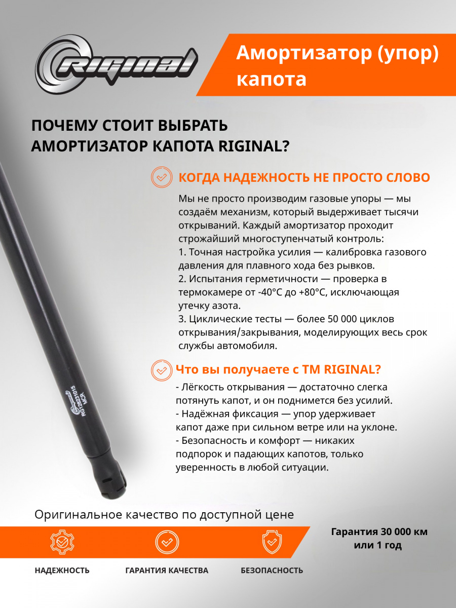Динамические упоры капота ТМ Riginal плавно и комфортно открывают и закрывают капот автомобиля. Упоры разработаны с учётом особенностей каждой модели автомобиля, с сохранением штатного угла открытия капота. Преимущества упоров капота ТМ Riginal: простая и быстрая установка без сверления, автоматический подъем и надежная фиксация капота, стабильная работа при температурах от -30°С до +50°С, долгий срок службы.
