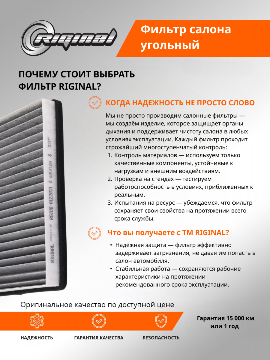 Салонный фильтр является важной деталью, обеспечивающей комфортное вождение. Он удерживает пыль, грязь и остальные мелкие частицы, которые могут попадать в салон, а также нейтрализует неприятные запахи благодаря активированному углю, содержащемуся в материале фильтра. Установка угольного фильтра гарантирует улучшение микроклимата внутри авто, что особенно важно при длительных поездках и в условиях городского трафика.Фильтр салона от TM Riginal - это надежное и доступное решение для очистки воздуха в автомобиле. Он обеспечивает качественную фильтрацию воздуха, удаляя вредные частицы и запахи. Установка фильтра проста и не требует специальных навыков. В ассортименте угольных фильтров салона ТM Riginal представлены различные модели, что позволяет выбрать наиболее подходящий вариант для каждого автомобиля. Кроме того, фильтры ТМ Riginal соответствуют всем требованиям и стандартам качества, а также могут быть использованы как замена оригинальным фильтрам без потери эффективности.