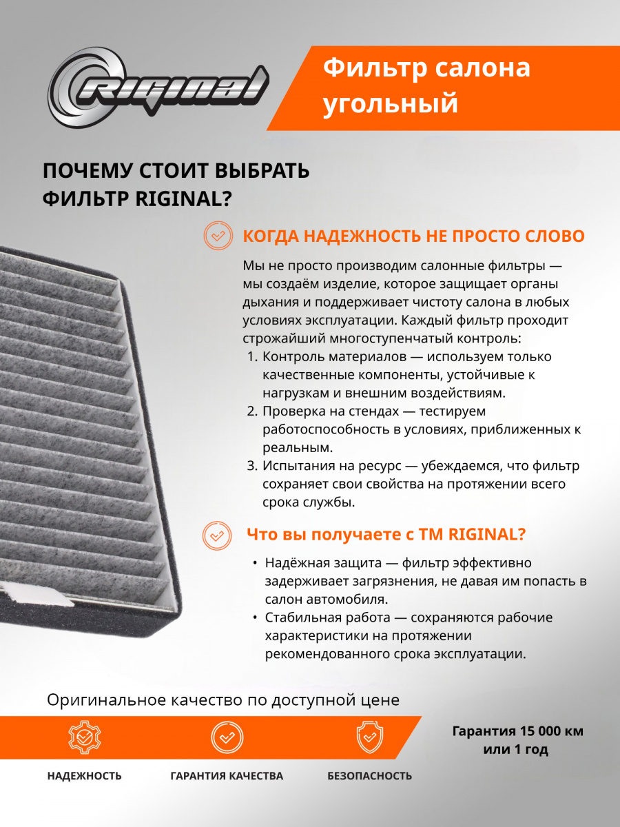 Салонный фильтр является важной деталью, обеспечивающей комфортное вождение. Он удерживает пыль, грязь и остальные мелкие частицы, которые могут попадать в салон, а также нейтрализует неприятные запахи благодаря активированному углю, содержащемуся в материале фильтра. Установка угольного фильтра гарантирует улучшение микроклимата внутри авто, что особенно важно при длительных поездках и в условиях городского трафика.Фильтр салона от TM Riginal - это надежное и доступное решение для очистки воздуха в автомобиле. Он обеспечивает качественную фильтрацию воздуха, удаляя вредные частицы и запахи. Установка фильтра проста и не требует специальных навыков. В ассортименте угольных фильтров салона ТM Riginal представлены различные модели, что позволяет выбрать наиболее подходящий вариант для каждого автомобиля. Кроме того, фильтры ТМ Riginal соответствуют всем требованиям и стандартам качества, а также могут быть использованы как замена оригинальным фильтрам без потери эффективности.