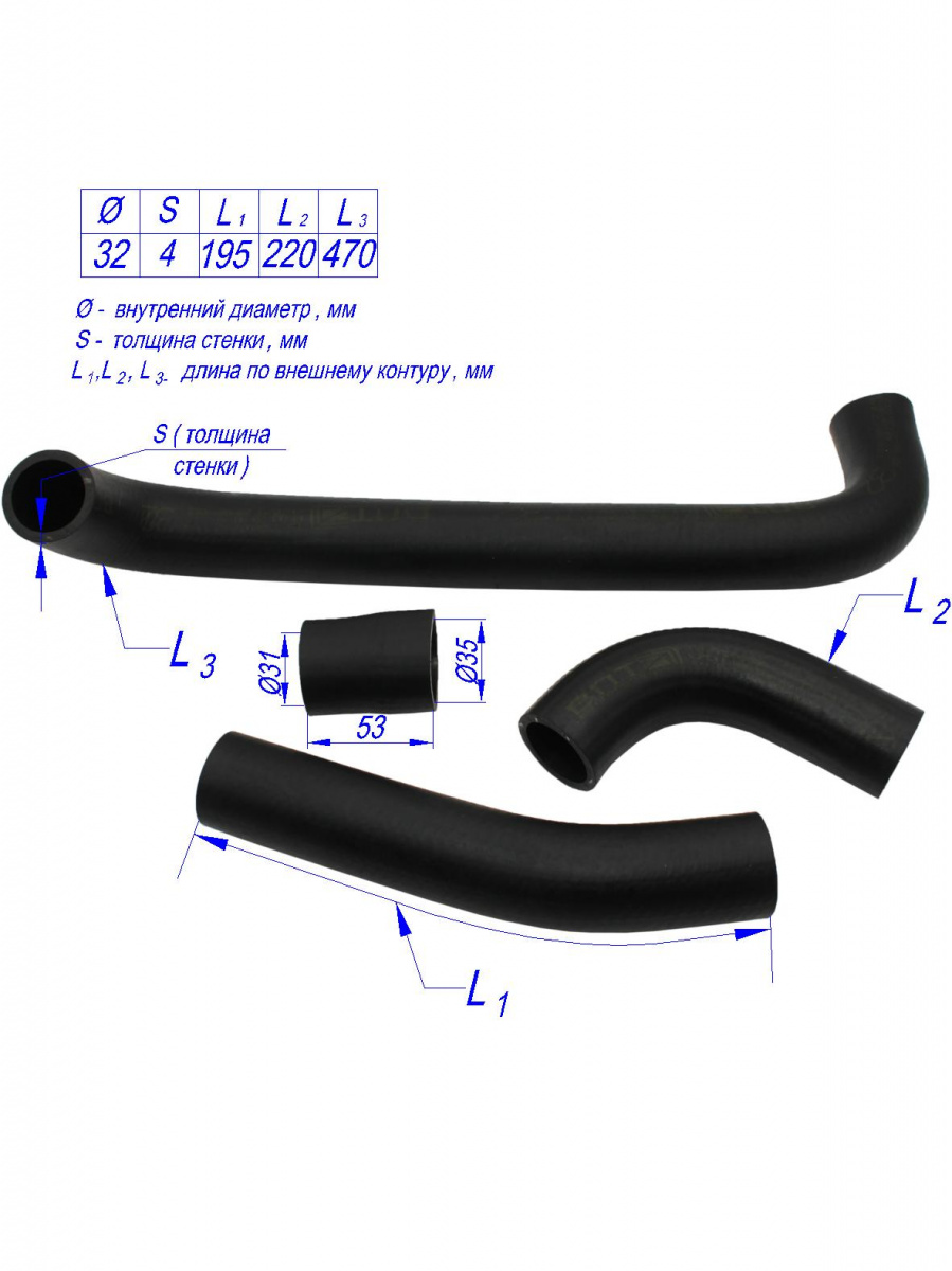 Патрубки изготовлены из высококачественной маслобензостойкой резины, сохраняющей требуемые характеристики работоспособности в диапазоне температур от -60 до +105 градусов. Точность формы патрубков гарантирует герметичность соединений, оплеточное усиление вискозной/полиэстровой нитью обеспечивает максимальное рабочее давление до 0,4МПа, высокую гибкость и хорошее поглощение вибраций.