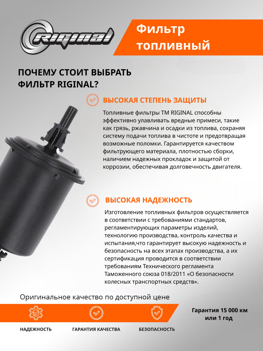 Топливные фильтры ТМ Riginal способны эффективно уливливать вредные примеси, такие как грязь, ржавчина и осадки из топлива, сохраняя систему подачи топлива в чистоте и предотвращая возможные поломки. Изготовление фильтров топливных осуществляется согласно международным стандартам ISO 9001, требованиям OEM и ГОСТ, что гарантирует высокую надежность и безопасность на всех этапах производства. Рассчитаны на длительный срок службы, что снижает необходимость частой замены и снижает затраты на обслуживание. Товар сертифицирован.