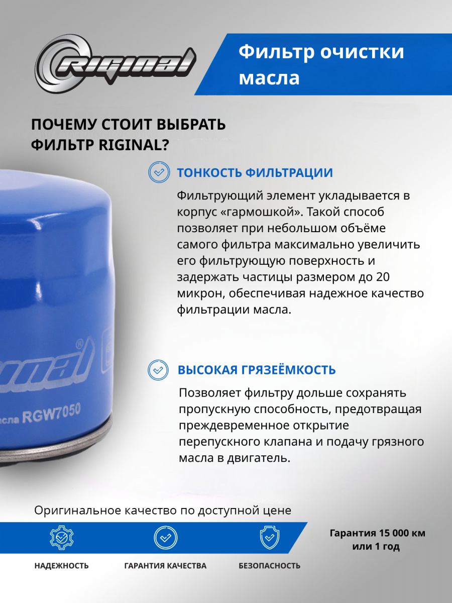 Фильтр масляный ТМ Riginal предназначен для качественной фильтрации смазочных масел в двигателях различных марок автомобилей.Оснащен высокоэффективным фильтрующим материалом Фильтрующий элемент укладывается в корпус «гармошкой». Такой способ позволяет при небольшом объёме самого фильтра максимально увеличить его фильтрующую поверхность и задержать частицы размером до 20 микрон. Фильтрующая гофра закреплена при помощи термореактивного клея. Корпус фильтра изготовлен из прочных и коррозионностойких материалов, запрессовка торцевых крышек надежная и точная, что гарантирует долговечность и надежность в различных условиях эксплуатации. Для производства антидренажного клапана используются специальные силиконовые материалы, обеспечивающие высокий уровень герметичности в условиях высоких температур. Значительная площадь герметизации фильтра, закругленные гладкие края отвечают за точную установку и максимальную защиту от утечек. Фильтр масляный ТМ Riginal является надежным решением для защиты двигателя.
