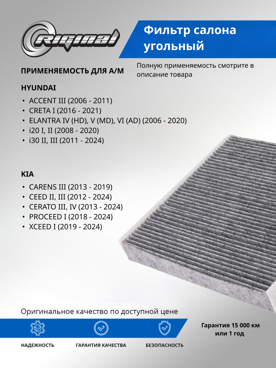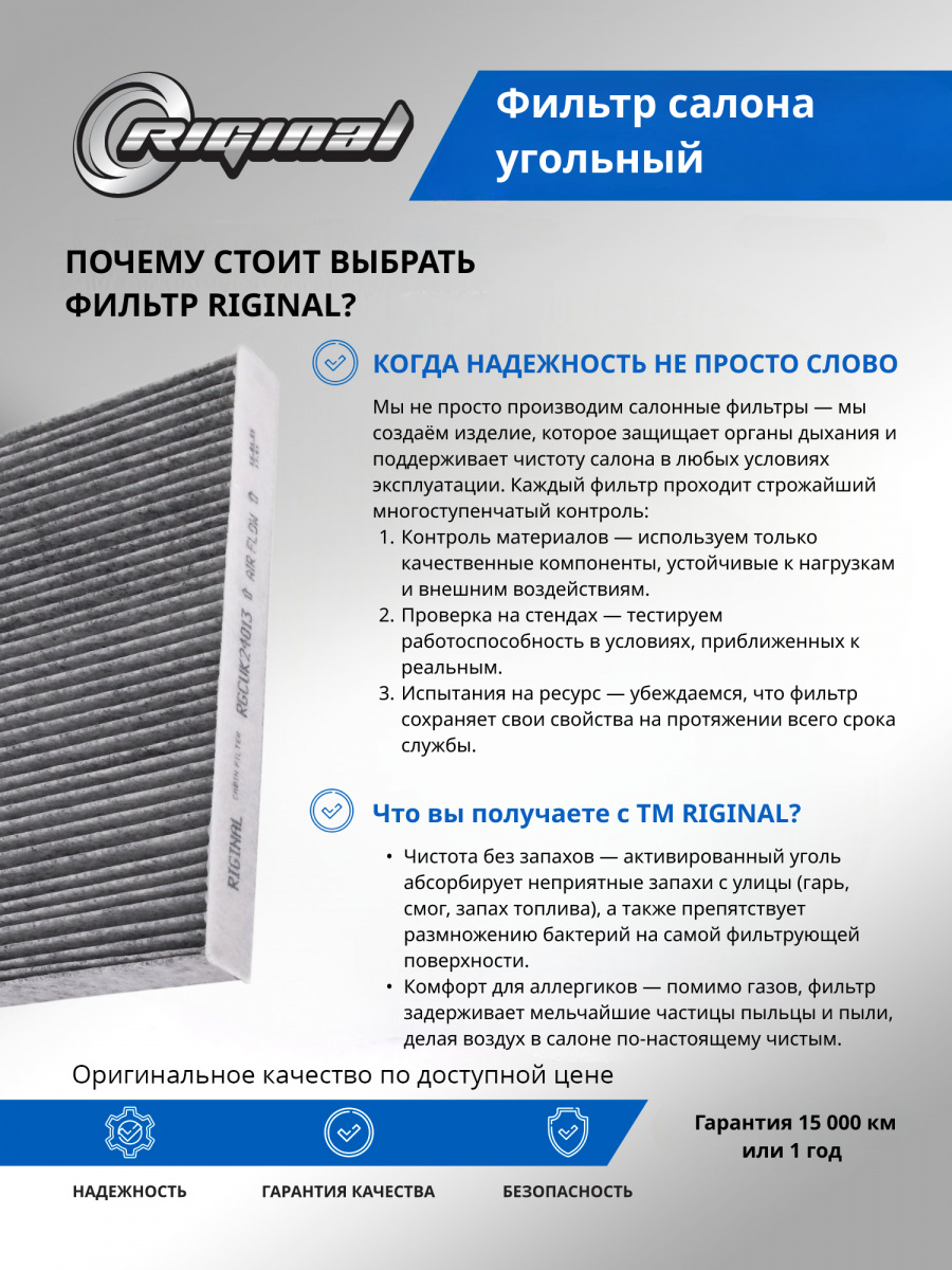 Салонный фильтр является важной деталью, обеспечивающей комфортное вождение. Он удерживает пыль, грязь и остальные мелкие частицы, которые могут попадать в салон, а также нейтрализует неприятные запахи благодаря активированному углю, содержащемуся в материале фильтра. Установка угольного фильтра гарантирует улучшение микроклимата внутри авто, что особенно важно при длительных поездках и в условиях городского трафика.Фильтр салона от TM Riginal - это надежное и доступное решение для очистки воздуха в автомобиле. Он обеспечивает качественную фильтрацию воздуха, удаляя вредные частицы и запахи. Установка фильтра проста и не требует специальных навыков. В ассортименте угольных фильтров салона ТM Riginal представлены различные модели, что позволяет выбрать наиболее подходящий вариант для каждого автомобиля. Кроме того, фильтры ТМ Riginal соответствуют всем требованиям и стандартам качества, а также могут быть использованы как замена оригинальным фильтрам без потери эффективности.