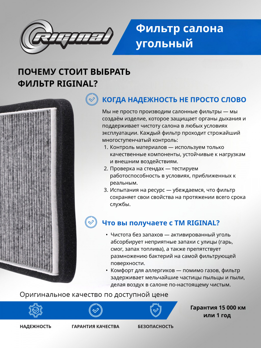 Салонный фильтр является важной деталью, обеспечивающей комфортное вождение. Он удерживает пыль, грязь и остальные мелкие частицы, которые могут попадать в салон, а также нейтрализует неприятные запахи благодаря активированному углю, содержащемуся в материале фильтра. Установка угольного фильтра гарантирует улучшение микроклимата внутри авто, что особенно важно при длительных поездках и в условиях городского трафика.Фильтр салона от TM Riginal - это надежное и доступное решение для очистки воздуха в автомобиле. Он обеспечивает качественную фильтрацию воздуха, удаляя вредные частицы и запахи. Установка фильтра проста и не требует специальных навыков. В ассортименте угольных фильтров салона ТM Riginal представлены различные модели, что позволяет выбрать наиболее подходящий вариант для каждого автомобиля. Кроме того, фильтры ТМ Riginal соответствуют всем требованиям и стандартам качества, а также могут быть использованы как замена оригинальным фильтрам без потери эффективности.