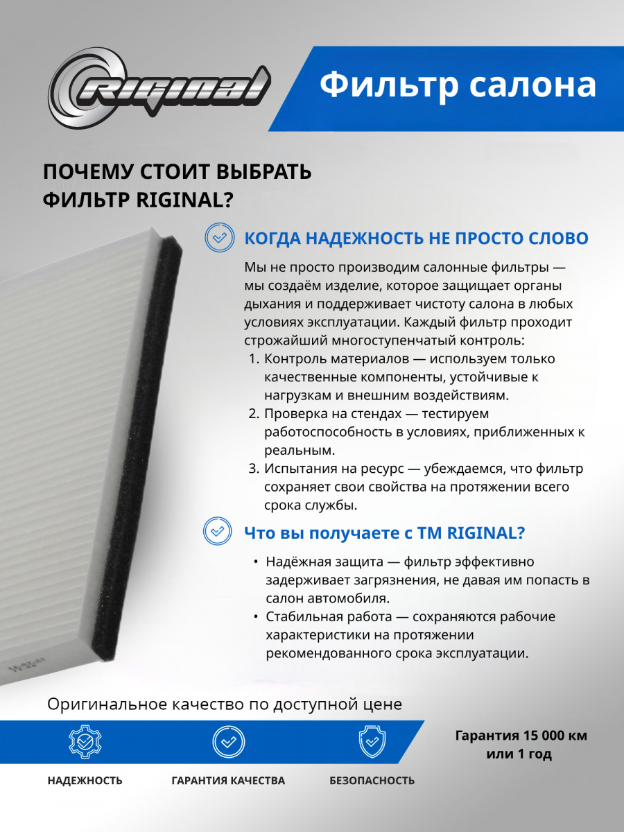 Фильтр салона от TM Riginal — это надежное и доступное решение для очистки воздуха в автомобиле. Он обеспечивает качественную фильтрацию воздуха, удаляя вредные частицы и запахи. Салонные фильтры ТМ Riginal отвечают самым высоким требованиям к пропускной способности благодаря использованию высококачественного фильтровального материала. Изготавливаются с учетом оригинальных геометрических параметров. Установка фильтра проста и не требует специальных навыков. В ассортименте Riginal представлены различные модели фильтров, что позволяет выбрать наиболее подходящий вариант для каждого автомобиля. Кроме того, фильтры ТМ Riginal соответствуют всем требованиям и стандартам качества, а также могут быть использованы как замена оригинальным фильтрам без потери эффективности.
