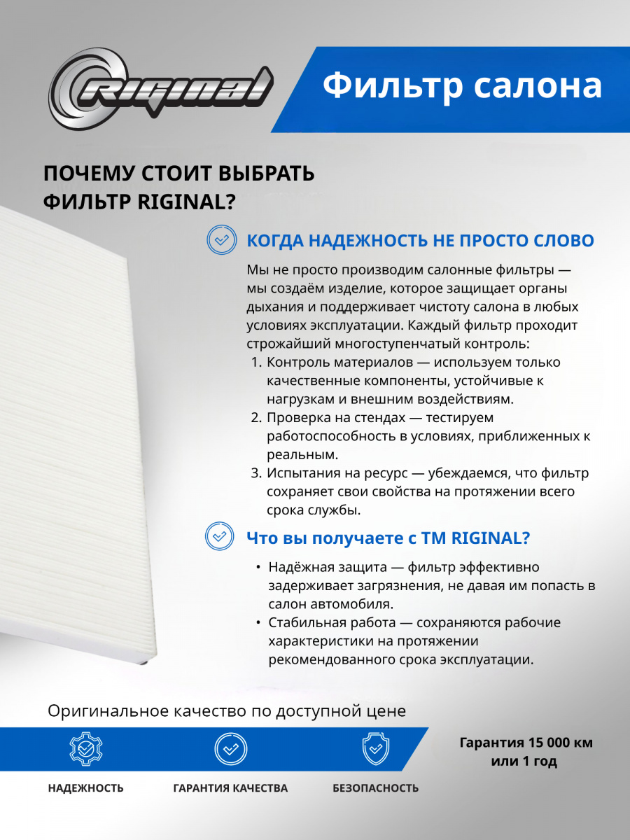 Фильтр салона от TM Riginal — это надежное и доступное решение для очистки воздуха в автомобиле. Он обеспечивает качественную фильтрацию воздуха, удаляя вредные частицы и запахи. Салонные фильтры ТМ Riginal отвечают самым высоким требованиям к пропускной способности благодаря использованию высококачественного фильтровального материала. Изготавливаются с учетом оригинальных геометрических параметров. Установка фильтра проста и не требует специальных навыков. В ассортименте Riginal представлены различные модели фильтров, что позволяет выбрать наиболее подходящий вариант для каждого автомобиля. Кроме того, фильтры ТМ Riginal соответствуют всем требованиям и стандартам качества, а также могут быть использованы как замена оригинальным фильтрам без потери эффективности.